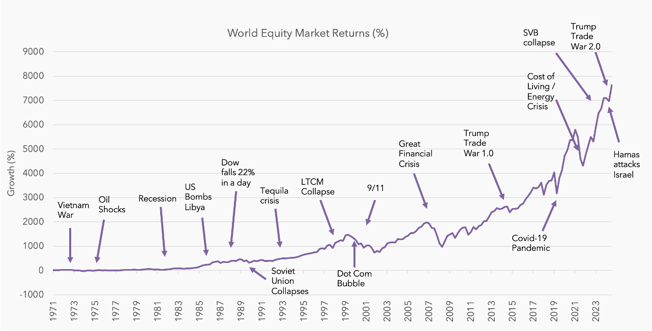 While global events may dominate headlines and fuel short-term volatility, financial markets are remarkably resilient. History shows that most geopolitical events — even major ones — tend to have a fleeting impact on markets. The chart below illustrates the world equity market through time; note that the long-term performance has not been materially impacted by challenging events, and shows that long-term rewards are realised by investing which is focused on underlying business and economic fundamentals rather than geopolitical upheaval and political cycles.